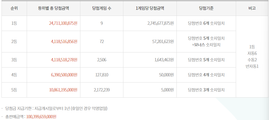 이번 주 로또 자동 당첨은 6명, 수동당첨은 2명, 반자동 당첨은 1명이다.