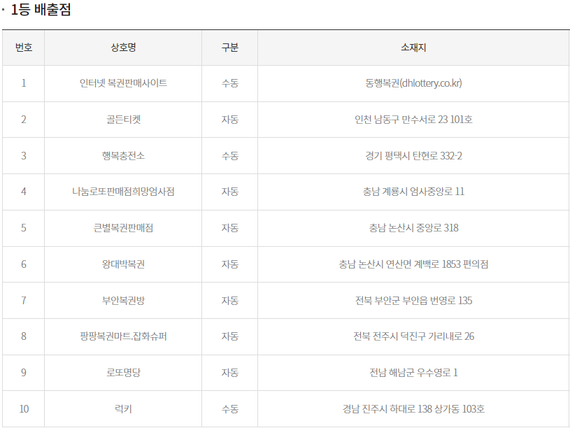 1027회 로또1등 당첨판매점은 자동을 선택한 7곳과 수동을 선택한 3곳으로 당첨지역은 동행복권사이트 1곳, 인천/경기/전남/경남 각각 1곳과 충남 3곳, 전북 2곳이다.