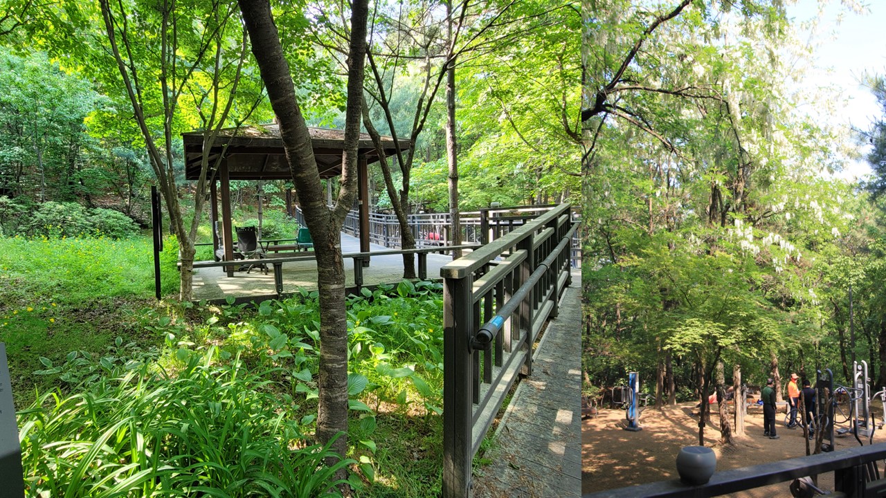 산속과 잘어울리는 정자 옆에는 운동기구가 설치되어 있고 몇몇 분들이 운동을 즐기고 있다. 그런데 나무데크길이 갑자기 끊기고 흙길이 시작되어 돌아올까 망설이다 휠체어가 못 갈 정도의 길은 아니기에 계속 전진한다. 평길이라 데크를 설치하지 않은 모양이다.