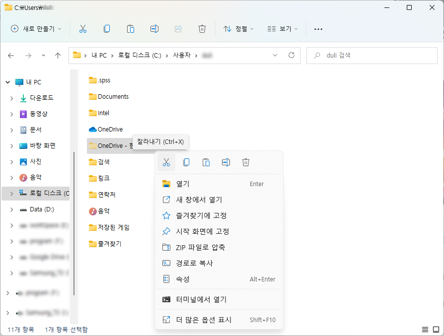 기존 원드라이브의 위치는 C:\Users\사용자 이름\OneDrive이다. 데이터의 이동은 간단히 잘라내기 후 붙여넣기로 진행하면 된다. 데이터가 많을수록 이동하는 시간은 많이 소요되므로 완료될 때까지 차분히 기다린다.
