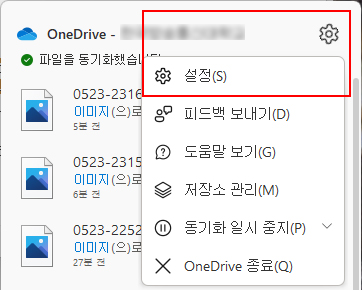 트레이영역에 있는 원드라이브 구름 아이콘을 클릭한 후 -> 톱니바퀴 아이콘을 눌러 설정을 찾아 클릭한다.