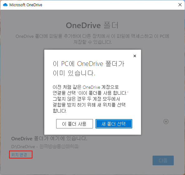 위치 변경을 클릭하여 변경하려는 폴더를 선택하면 이미 OneDrive폴더가 있다는 팝업창이 뜬다. 왜냐하면 이미 붙여넣기를 한 곳으로 위치를 변경하기 때문이다. "이 폴더 사용"버튼을 누른 후 다음을 누른다.