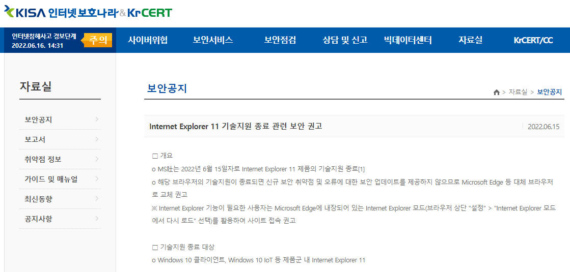 IE 종료에 맞추어 과기정통부와 KISA는 보호나라&KrCERT/CC 누리집(www.boho.or.kr)에 보안공지를 통해 보안조치 사항을 재차 안내하였으며(6.15),
