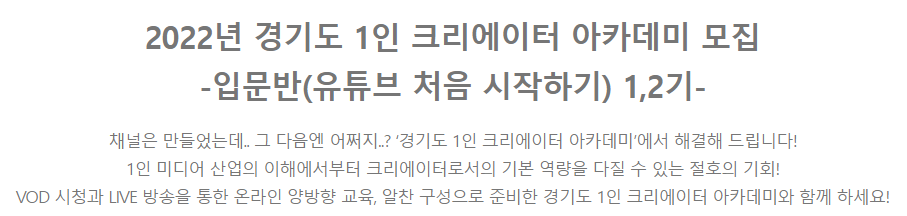 ‘2022년 경기도 1인 크리에이터 아카데미’의 자세한 공고 내용과 접수 방법은 경기콘텐츠진흥원 누리집(https://www.gcon.or.kr/) 내 알림 마당 > 교육 및 행사 게시판에서 확인할 수 있다.