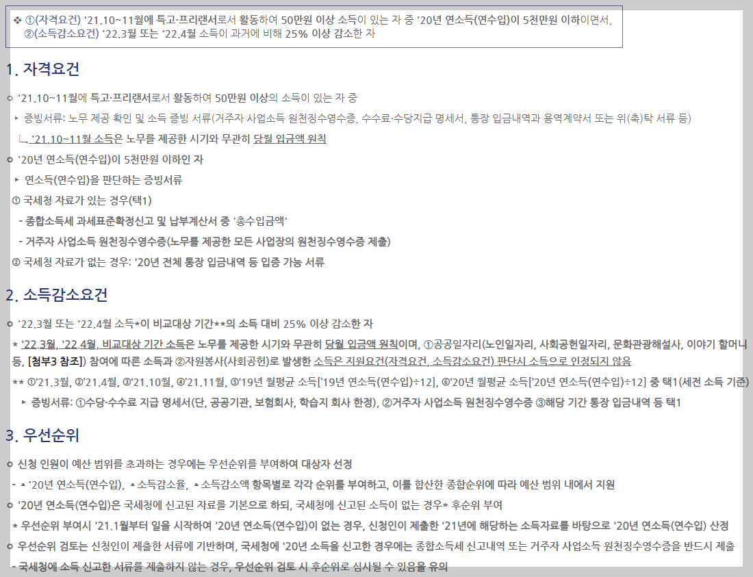 ①자격요건: ‘21년 10월~11월에 특고·프리랜서로서 50만 원 이상 소득이 발생, ’ 20년 연소득(연수입)이 5천만 원 이하