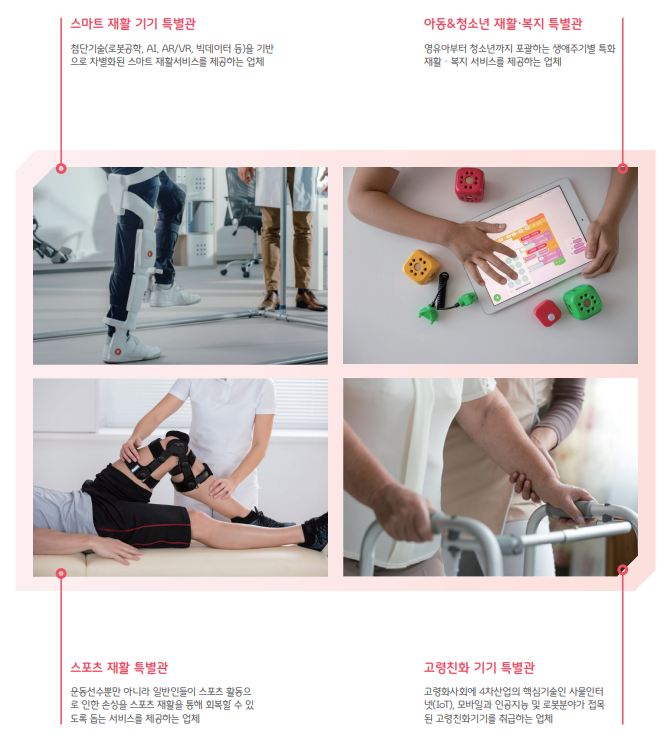 全 연령별 맞춤형 재활·복지 플랫폼을 구축한다. 재활치료가 필요한 아동과 청소년에게 특화된 아동&청소년 재활·복지 특별관 및 노년층을 위한 고령친화 기기 특별관, 융합기술 및 스마트 기술, 기능형 로봇 기술기기 등을 선보일 수 있는 스마트 재활기기 특별관, 스포츠 활동으로 말미암은 손상 재활에 특화된 스포츠 재활 특별관이 구성된다.