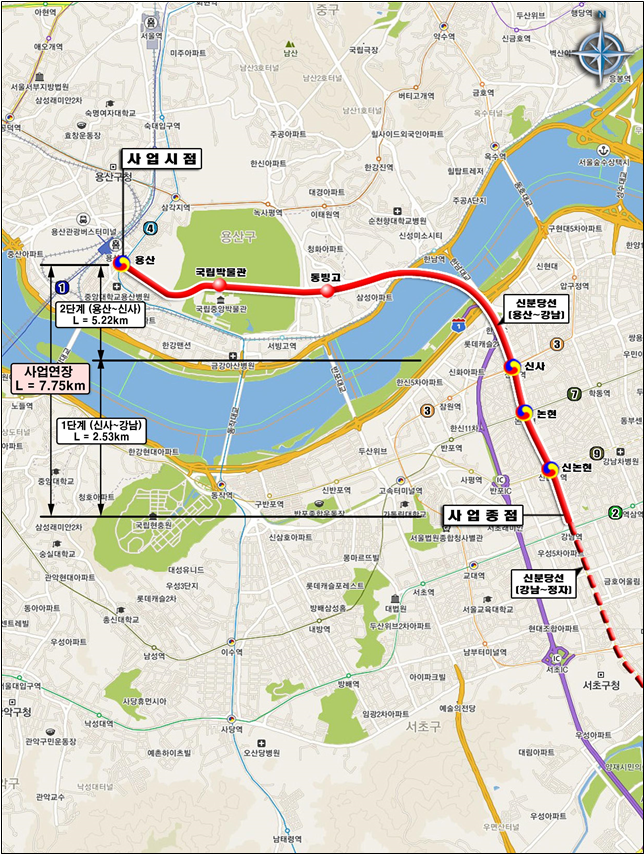 신사~용산까지 총 5.3km 구간은 미군기지 반환 이전에 정거장 개착공사 등을 할 수 있도록 대안노선을 마련하고 있으며, 국방부‧미군‧국립중앙박물관 등 관계기관 협의를 거쳐 올해 안에 최종 노선을 확정할 계획이다.