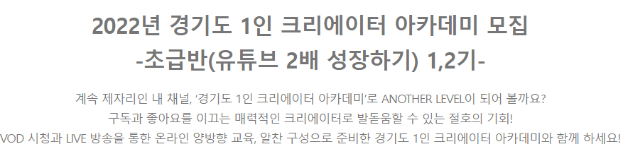 ‘2022년 경기도 1인 크리에이터 아카데미’의 자세한 공고 내용과 접수 방법은 경기콘텐츠진흥원 누리집(https://www.gcon.or.kr/) 내 알림 마당 > 교육 및 행사 게시판에서 확인할 수 있다.