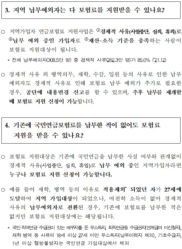 2022년 7월 1일부터 국민연금 지역가입자 중 사업 중단·실직·휴직 사유의 납부예외자를 대상으로 보건복지부가 연금보험료 지원사업을 실시한다.