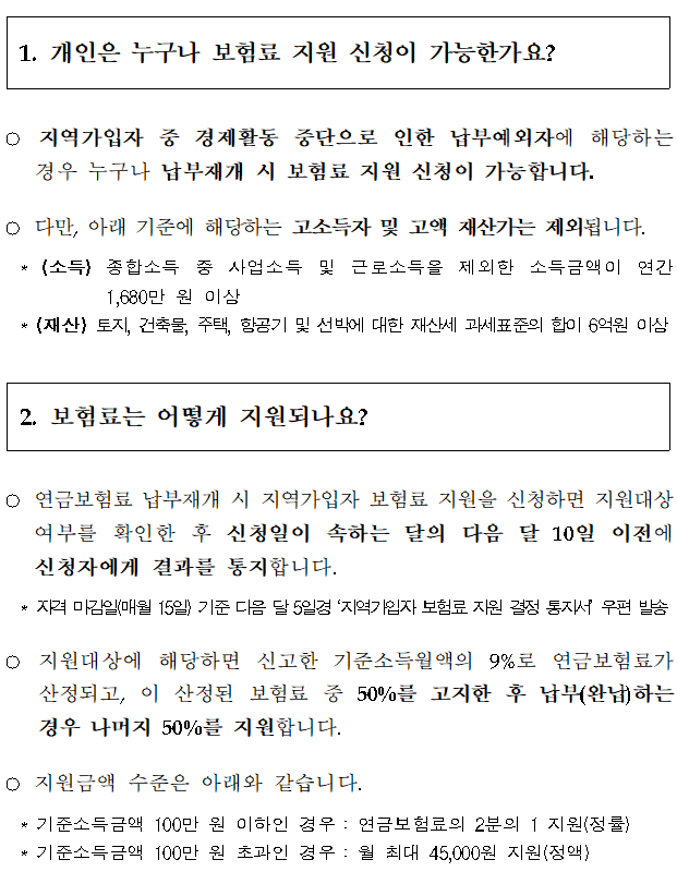 이번 지원으로 지역 납부예외자 중 사업중단·실직·휴직으로 연금보험료를 납부하지 못했던 약 22만 명*이 하반기 납부를 재개하여 연금보험료 지원을 받을 것으로 예상된다.