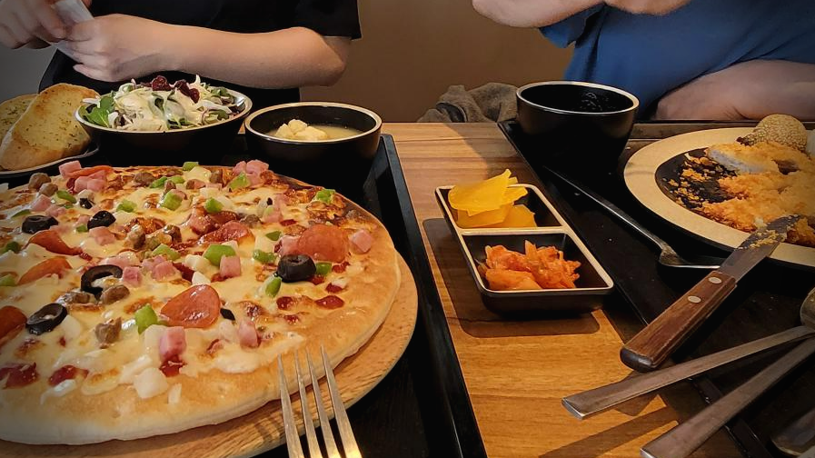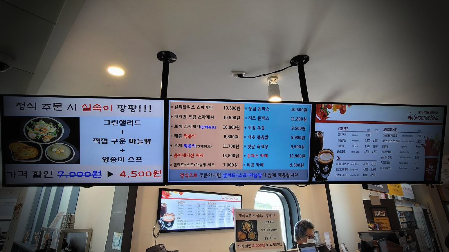 4층에는 편의점(이마트24)과 카페(스무디킹), 푸드코트, 한식당 경복궁, bhc가 있는데 한식당과 푸드코트를 왔다 갔다 고민하다가 결국 푸드코트의 피자 정식과 등심 돈가스 정식으로 결정했다.