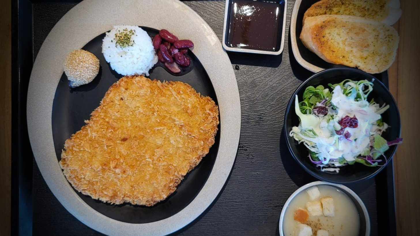 정식 주문 시 샐러드와 마늘빵, 양송이 스프가 함께 제공되었기 때문이다. 판매 가격은 샐러드+수프+마늘빵 세트가 7천 원(가격 할인 7천 원 -> 4천5백 원)으로 세트로 판매되는 음식은 어떻게 나오는지 모르겠으나 정식에 제공된 양은 그다지 많지는 않았다.