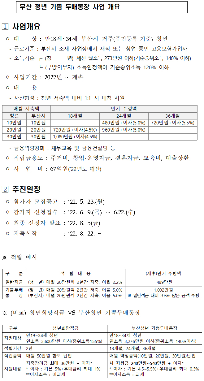 부산시는 부산은행과 업무협약을 맺고 오는 8월 ‘부산청년 기쁨두배통장’을 출시한다고 밝혔다. ‘부산청년 기쁨두배통장’은 최대 540만 원까지 저축할 수 있으며, 부산시가 저축액만큼 지원하고 발생 이자까지 더하면 만기 수령액이 최대 1,110만 원까지 가능하다.