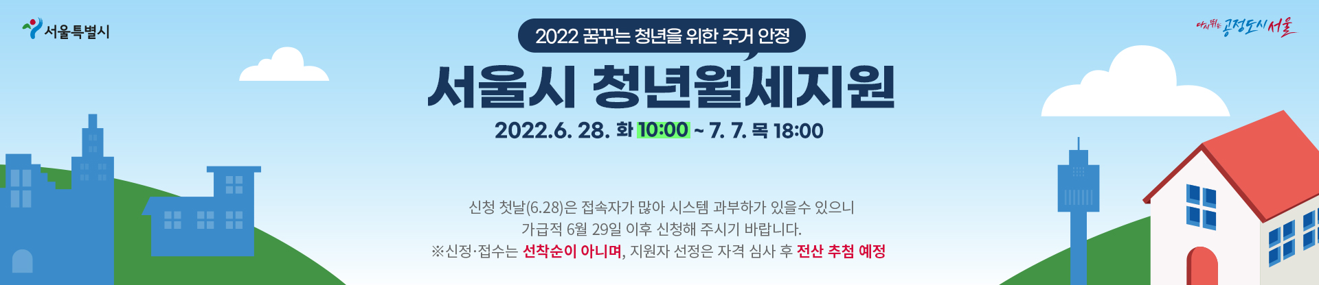 신청은 6.28(화) 오전 10시~7.7.(목) 18시까지며, 세부적인 지원기준과 구비서류는 서울주거포털 내 공지사항에서 확인할 수 있다. 문의는 서울 주거 포털 1:1 온라인 상담창구, 다산콜센터(☎02-120), 서울주택도시공사 콜센터(☎1600-3456)로 연락하면 된다.