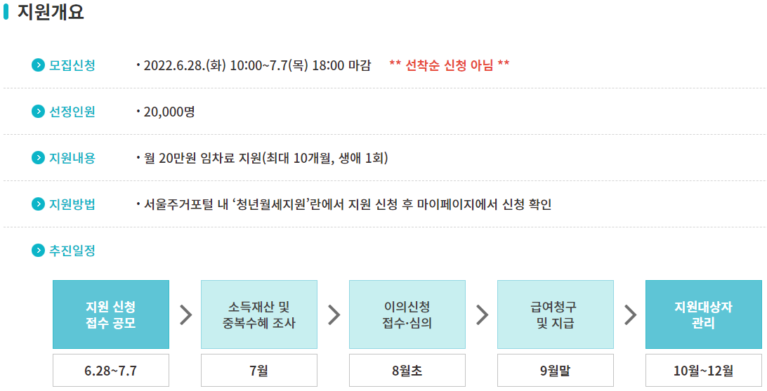 서울에 주민등록이 되어 있으면서 실제 거주하고 있는 만 19세~39세(주민등록등본상 출생연도 1982~2003년) 청년 1인 가구 중에서 기준중위소득 150% 이하가 대상이다. 최종 지원대상은 심사를 거쳐 8월 말 선정‧발표되며, 실제 지원은 10월 시작된다.