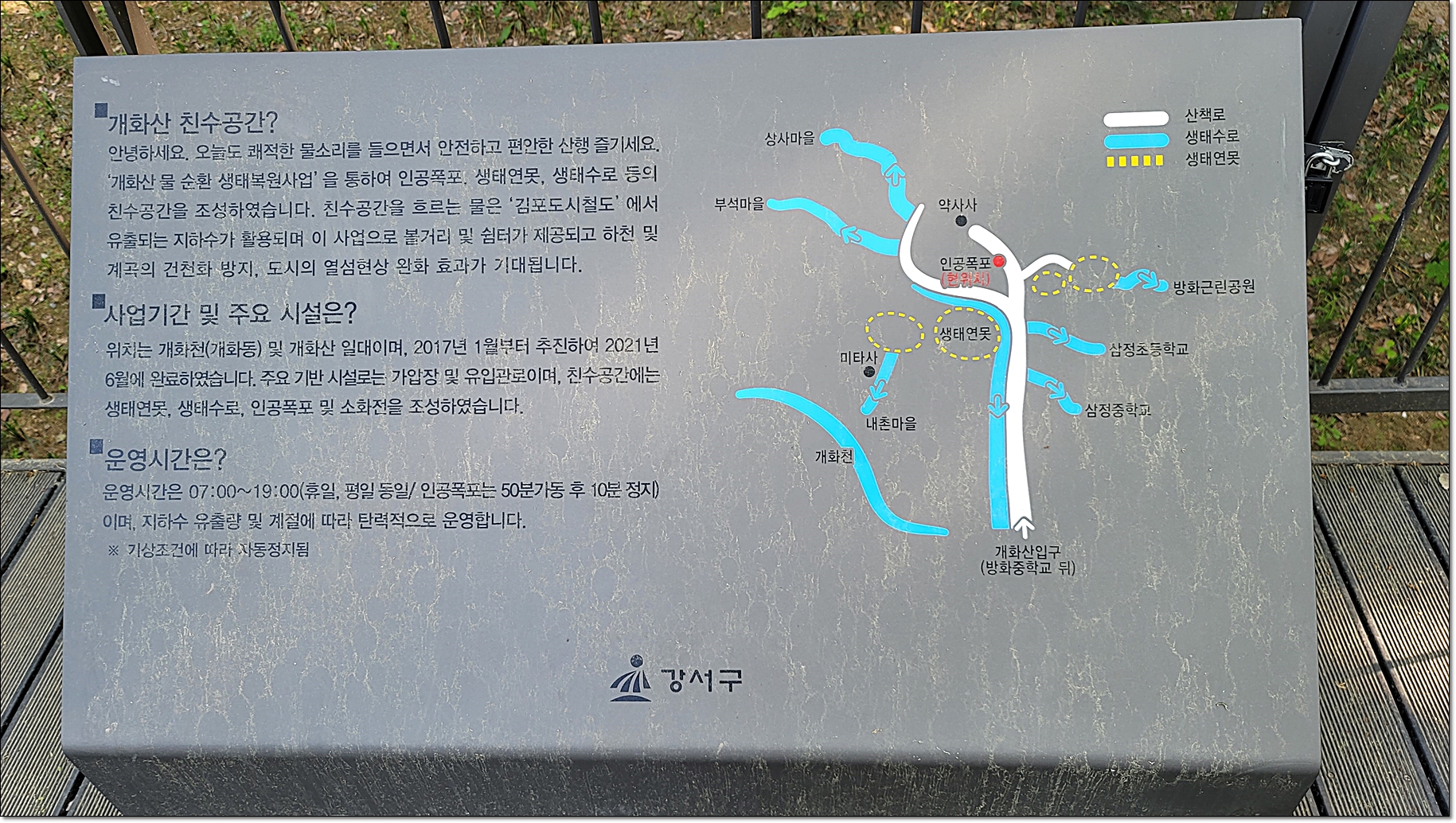 수량이 유난히 많고 비가 내리지 않았는 데도 쾌적한 물소리가 들린다는 의문은 개화산 친수공간 안내를 읽고 해소되었다. 개화산 물 순환 생태복원사업을 통하여 인공폭포, 생태연못, 생태수로 등의 친수공간을 조성한 것이다. 친수공간을 흐르는 물은 김포도시철도에서 유출되는 지하수가 활용되며 이 사업으로 볼거리 및 쉼터가 제공되고 하천 및 계곡의 건천화 방지, 도시의 열섬현상 완화 효과가 기대된다.