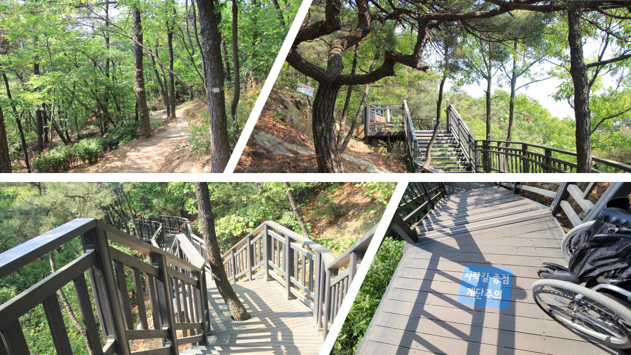 아쉽게도 더이상은 휠체어로 진입하기가 어렵다. 계단을 내려가 앞을 살펴보니 나무데크 계단길이 끝나는 곳은 비포장길로 휠체어로는 돌아보기 힘든 길이다.