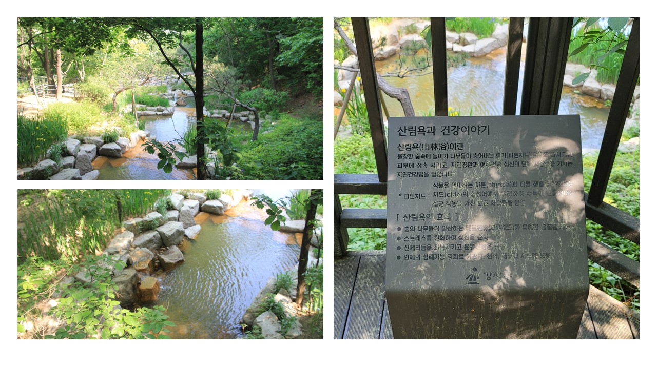 나무테크로 잘 조성되어 있는 길이 시작하자 물소리와 아카시아 향이 귀와 코를 활짝 열리게 한다. 생각보다 많은 물이 흐르고 있었다. 이곳에 설치된 산림욕과 건강이야기에는 산림욕이란? 울창한 숲 속에 들어가 나무들이 뿜어내는 피톤치드를 직접 마시거나 피부에 접촉시키고 자연경관과 어우러져 심신의 단련과 안정을 가지는 자연건강법을 말한다.