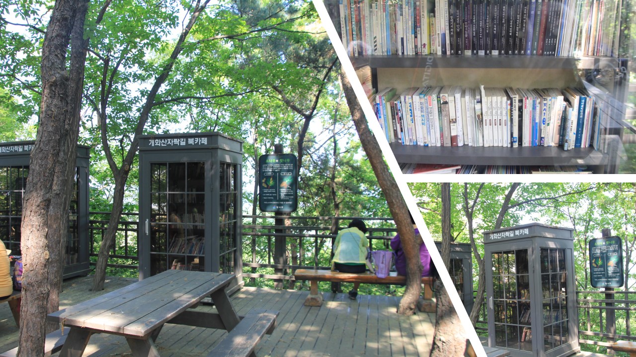무장애 숲길에는 중간중간 쉼터에 참나무 북카페가 설치되어 있다. 어르신 몇 분 이서 즐거운 담소를 나누고 계신 틈을 사이로 책장을 들여다본다.
