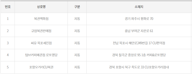 5. 포항오거리CU복권 자동 경북 포항시 북구 죽도로 33 CU포항오거리점내
