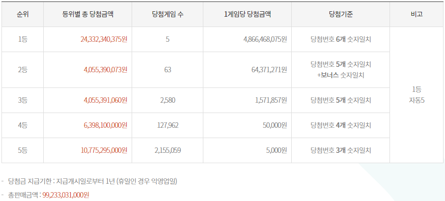 이번주 로또 자동당첨은 5명, 수동당첨은 0명이다.