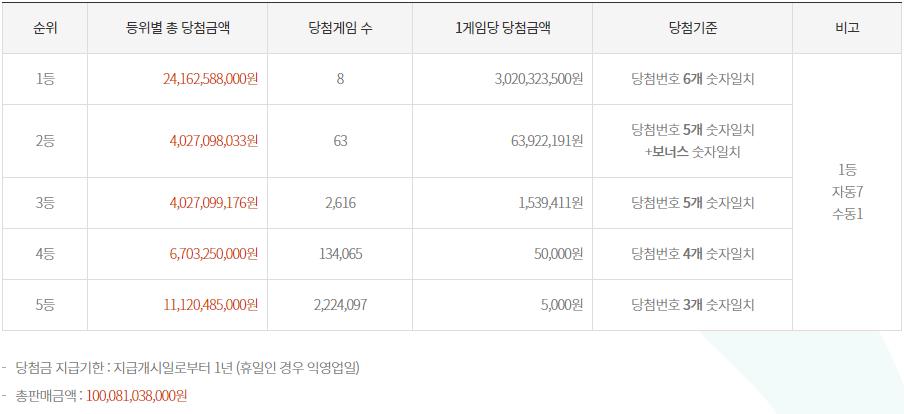 6개 모두 숫자가 일치하는 1등 게임수는 8게임으로 각각 30억 2,032만 3,500원이 1등 당첨금액으로 지급된다.