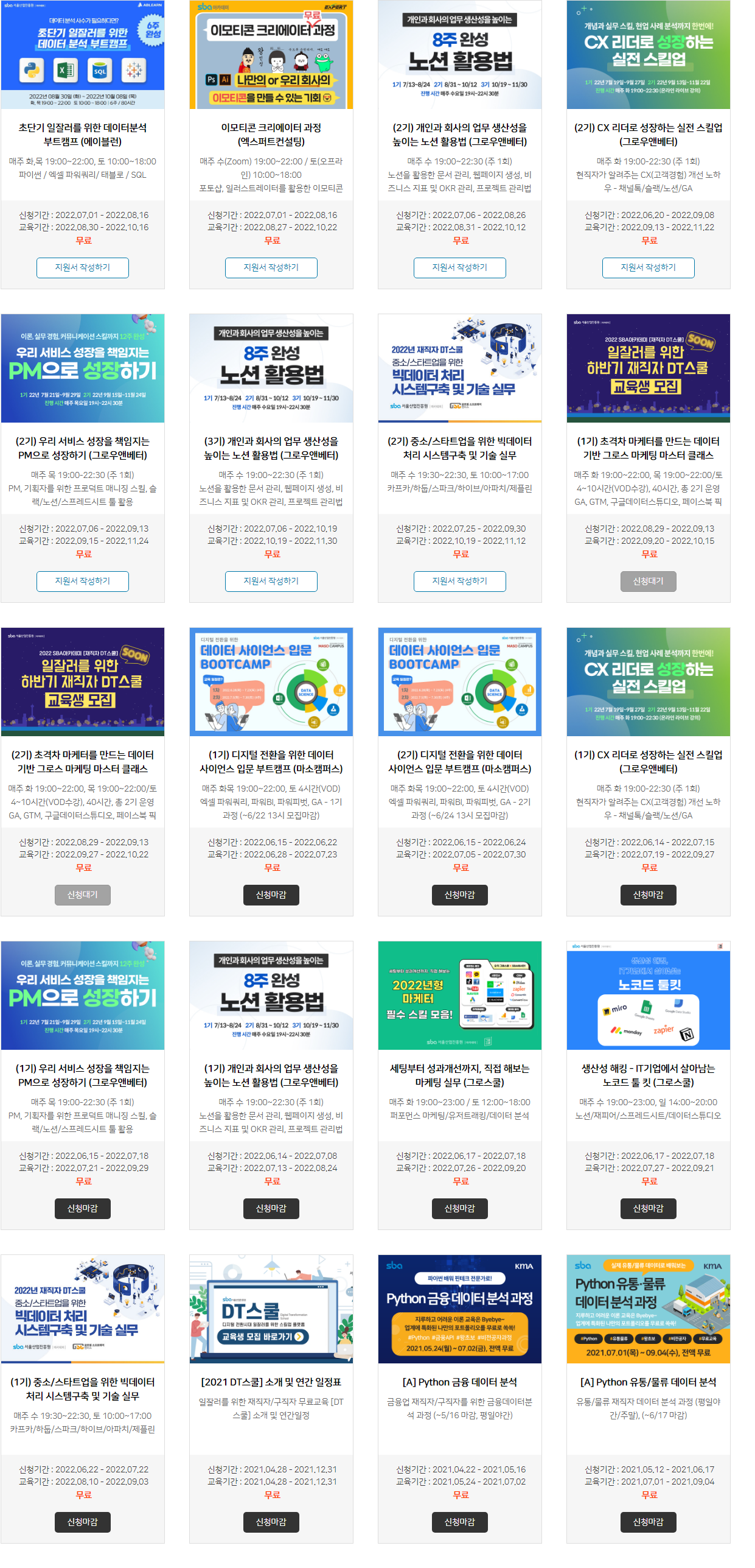 재직자가 수강할 수 있는 평일 야간, 주말 과정으로 운영되는 30~80시간 내외의 무료 교육이며, 비대면 실시간/VOD로 제공되며 일부 강의는 오프라인 교육도 병행된다.