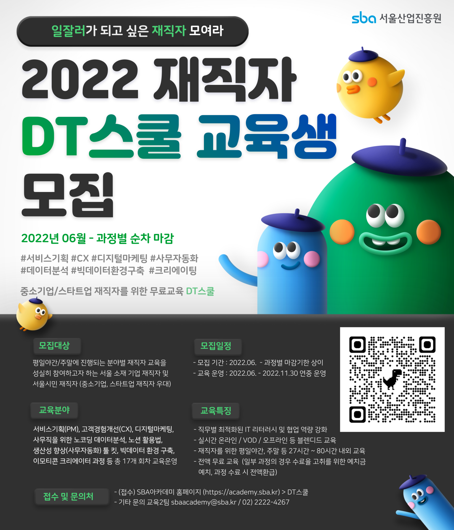 오늘 9월까지 2022년도 ‘Digital Transformation School(이하 DT스쿨)’의 재직자 교육생을 중소기업 지원기관 '서울산업진흥원'이 모집한다.