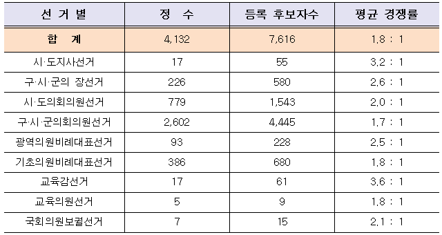 5월 13일 후보자 등록을 마감한 결과 2,324개 선거구에서 총 7,616명이 등록하여 평균 1.8대 1의 경쟁률을 보였다고 중앙선관위는 밝혔다.