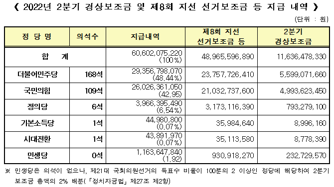 경상보조금은 보조금 배분 대상 정당에 매년 분기별로 균등 분할하여 지급하며, 2분기에는 6개 정당을 대상으로 116억3천6백만여 원이 지급되었다.