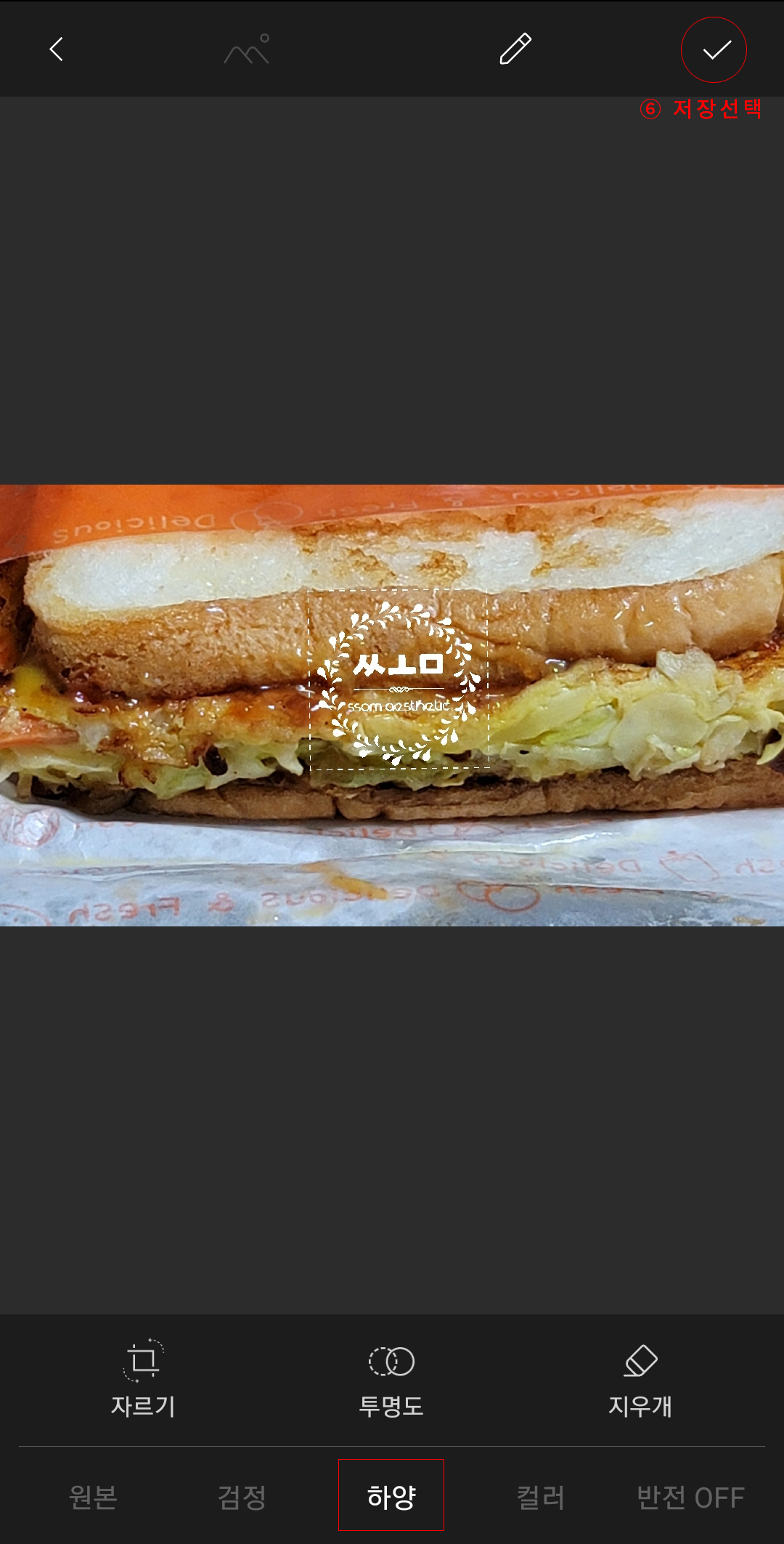 색상을 하양으로 선택한 후의 화면이다. 사이즈 조정과 위치선택, 색상 선택이 끝났다면 이제 마지막으로 화면 우측 상단의 체크표시를 선택(⑥ 저장선택)하면 저장된다. 저장된 이미지는 스마트폰 갤러리에서 확인할 수 있다.
