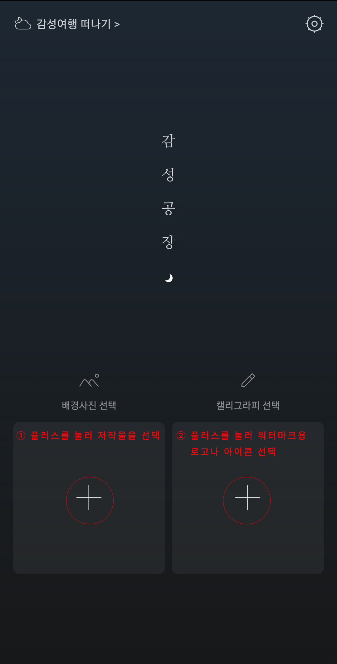 배경 사진 선택 아래 플러스 기호를 눌러 미리 준비한 저작물을 선택한 후(① 플러스를 눌러 저작물을 선택), 캘리그라피 선택 아래 플러스 기호를 눌러 워터마크용 로고 이미지를 선택한다(② 플러스를 눌러 워터마크용 로고나 아이콘 선택)