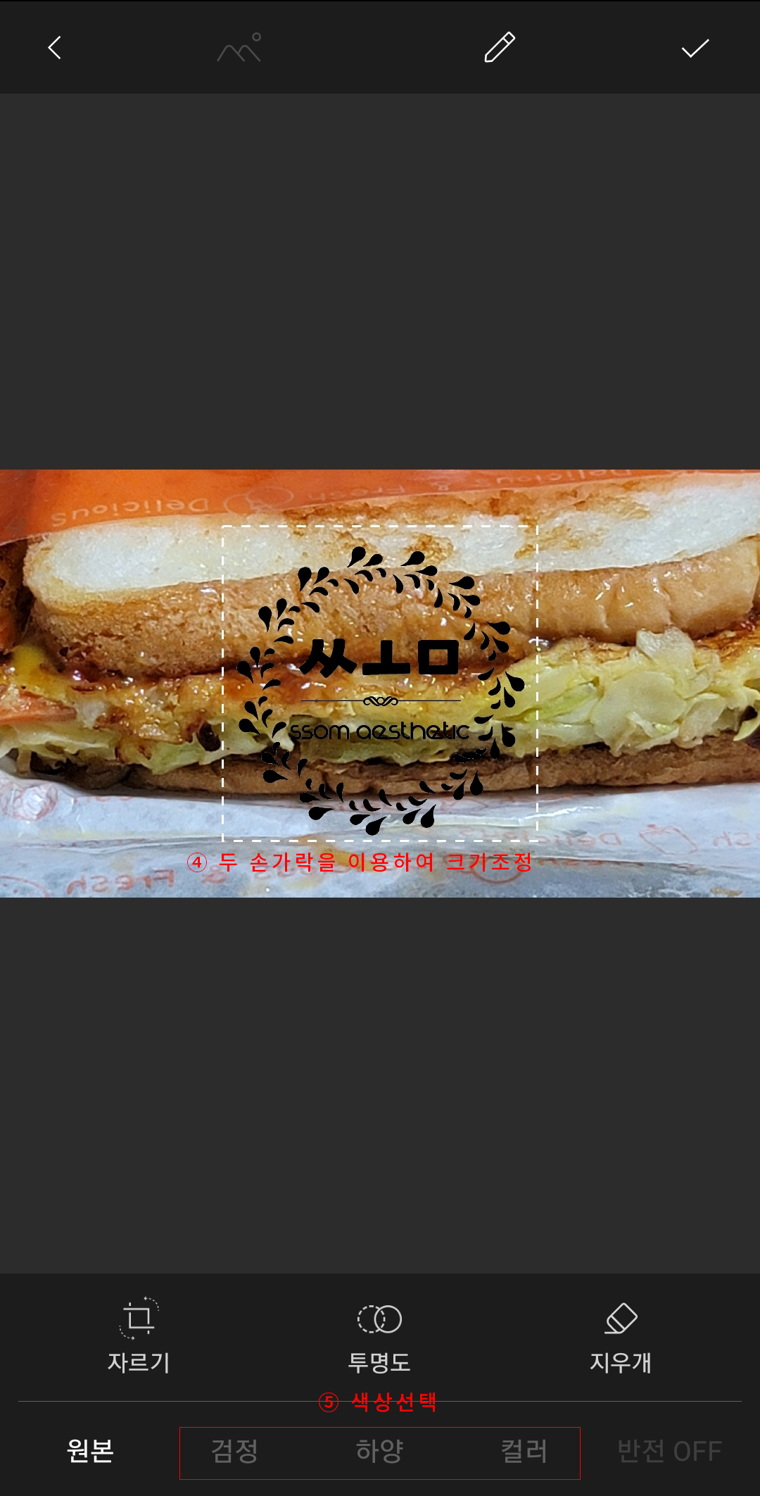합성하기를 선택하고 나면 다음과 같은 화면을 만나게 되고 워터마크용 사각화면을 두 손가락을 사용하여 조정하면 크기를 조절(④ 두 손가락을 이용하여 크기 조정)할 수 있다. 알맞은 선택 화면이 끝나면 하단의 검정이나 하양, 또는 컬러를 선택(⑤ 색상 선택)하여 색상을 바꿀 수 있다.