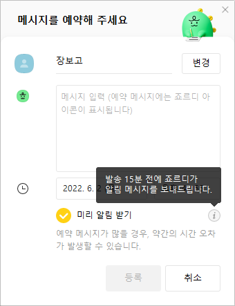 메시지 예약은 죠르디 도구를 실행 후 나타나는 메뉴에서 메시지 예약을 선택한다.