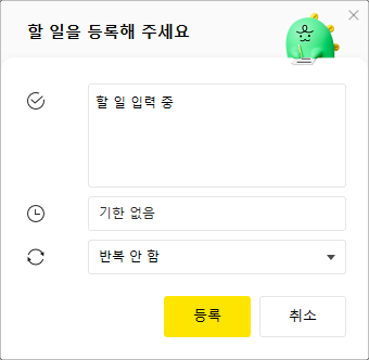 ① 할 일을 입력 후 기한과 반복 여부를 설정 후 등록버튼을 선택한다.