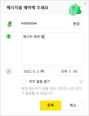 ④ 미리 알림 받기는 15분 전 미리 알림 메시지를 보내준다. 필요시 알림 받기 체크박스를 선택한다.