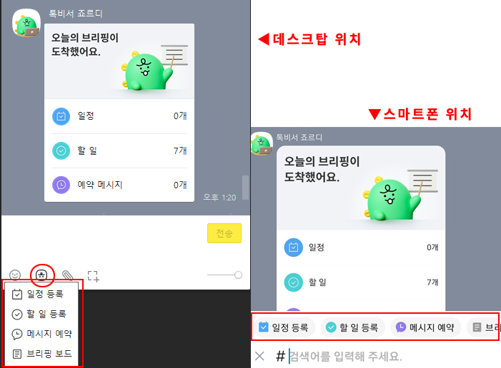 카카오톡 pc버전과 스마트폰의 위치가 서로 다르다. pc버전은 대화 입력창 좌측 하단 이모티콘 선택 아이콘 바로 옆에 위치하고, 스마트폰에서는 해시태그를 선택하면 대화창 바로 위에 위치한다.