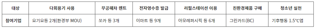 탄소중립 실천행동 적립가능 업체 목록은 아래와 같으며 참여기업은 지속적으로 확대해 나갈 예정이며, 참여기업 목록은 매월 "탄소중립실천포인트 홈페이지-참여기업" 안내에서 업데이트한다.