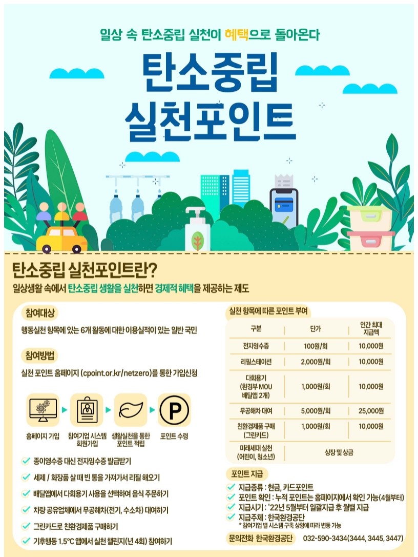 탄소중립실천포인트가 무엇일까? 국민의 탄소중립 생활실천문화 확산을 위해 민간기업의 다양한 친환경활동 이용 시 이용실적에 따라 인센티브를 지원하는 제도이다.