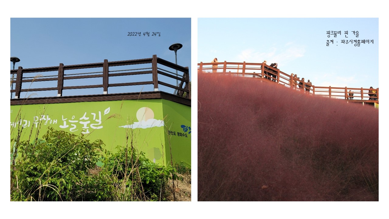 날이 맑지 않아 전망대에 전시한 사진보다 시야는 나오지 않아 못내 아쉬웠다. 헤이리무장애노을숲길의 총길이는 1킬로미터, 전망대까지 높이는 100미터다. 정상인 걸음으로 20분이면 정상에 올라 임진강 넘어 북쪽을 바라볼 수 있다. 목재테크는 새로 단장해서인지 페인트 내음이 물씬 풍겼다.