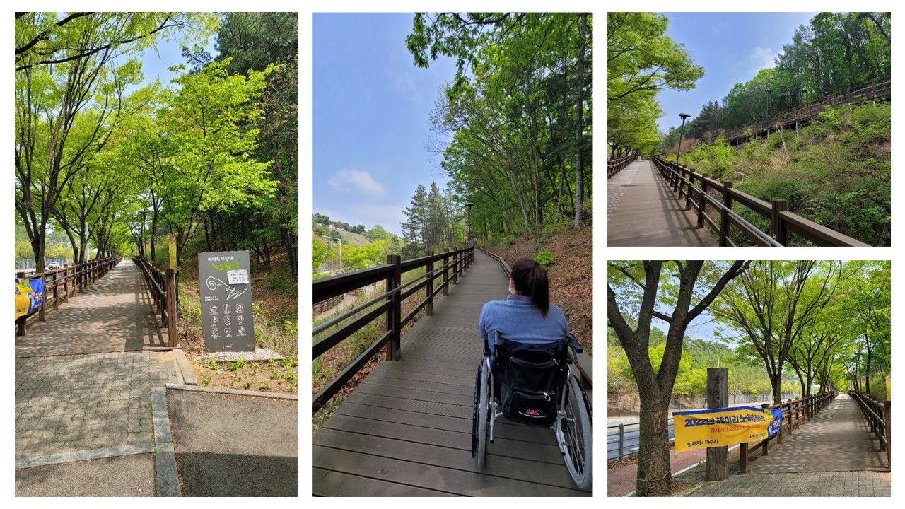 정보를 좀 더 꼼꼼히 보고 가야 했다. 무장애 숲길이라 해서 평탄한 길을 생각하고 집을 나섰다가 뒷동산을 오른다는 생각으로 아내의 휠체어를 밀고 올라갔다.