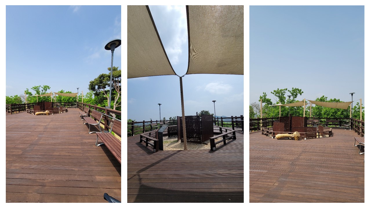 날이 맑지 않아 전망대에 전시한 사진보다 시야는 나오지 않아 못내 아쉬웠다. 헤이리무장애노을숲길의 총길이는 1킬로미터, 전망대까지 높이는 100미터다. 정상인 걸음으로 20분이면 정상에 올라 임진강 넘어 북쪽을 바라볼 수 있다. 목재테크는 새로 단장해서인지 페인트 내음이 물씬 풍겼다.