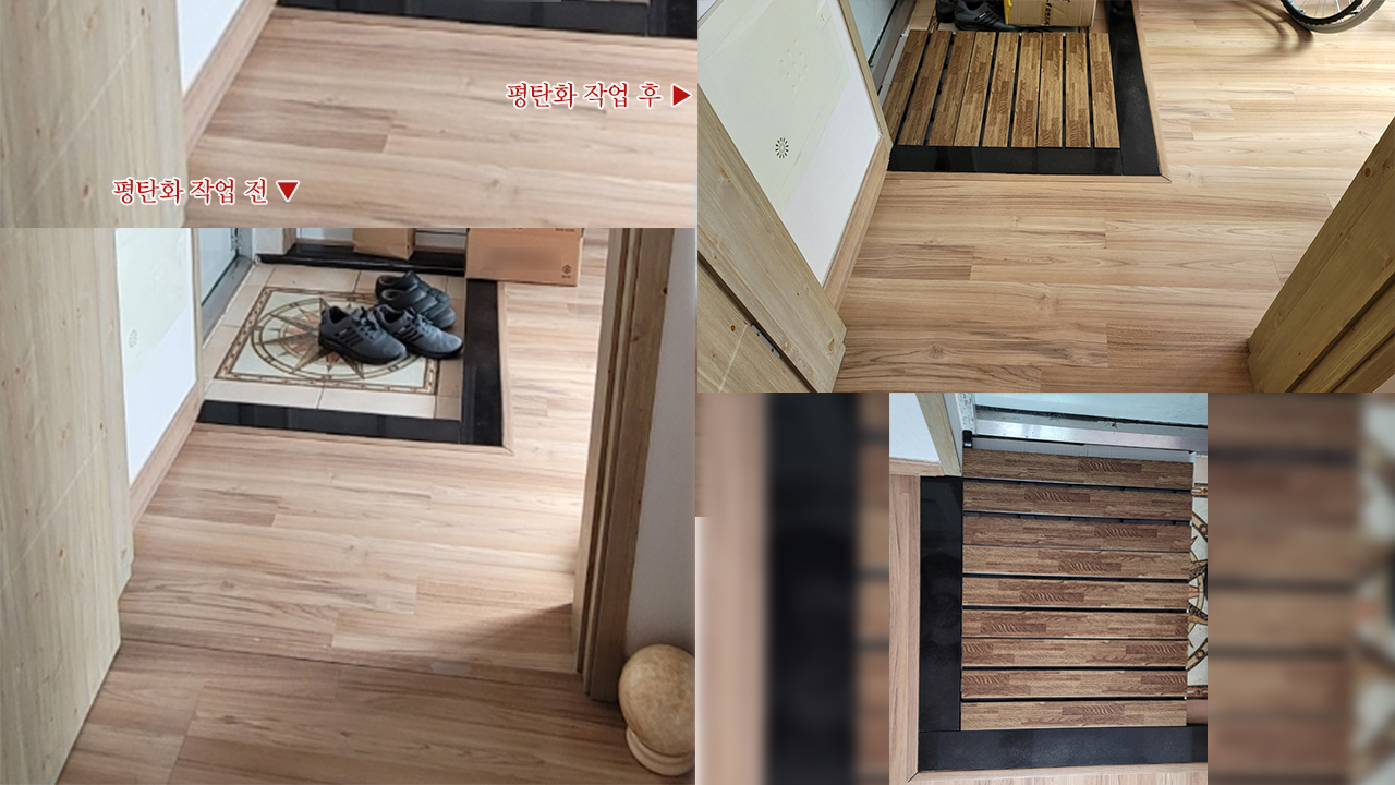 나무로 나와 있는 욕실 발판 5천 원짜리 4개와 퍼즐 매트 5천 원짜리 1개를 이용하니 제법 그럴싸하게 평탄화 작업이 완성되었다. 총비용 2만5천원으로 현관 평탄화 작업 끝.
