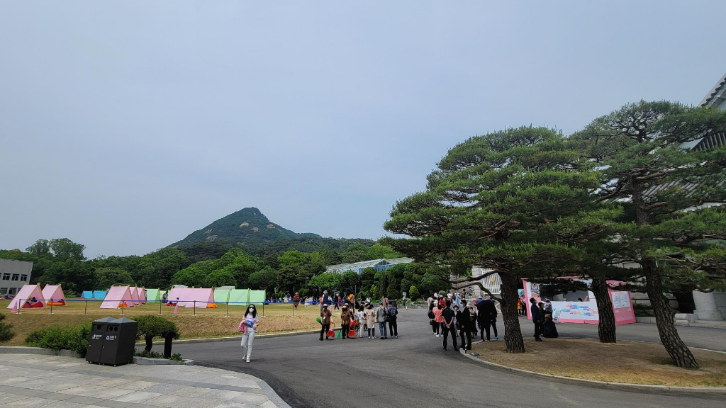 춘추문을 통과해 진입했기에 엘리베이터를 타고 춘추관 앞이 출발점이었다. 춘추관 앞 헬기장에는 그늘막 텐트가 마련되어 있었는데 관람객들로 가득 차 있었다.