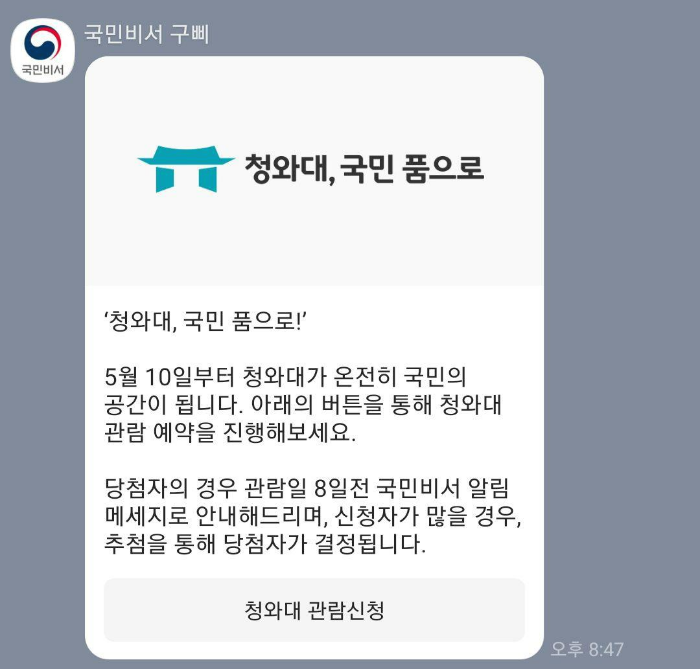 청와대 관람 신청은 카카오 국민비서 구삐를 통해 신청부터 결과까지 일사천리로 진행되었다.