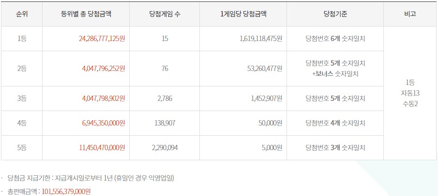 6개 모두 숫자가 일치하는 1등 게임수는 15게임으로 각각 16억 1,911만 8,475원이 1등 당첨금액으로 지급된다.