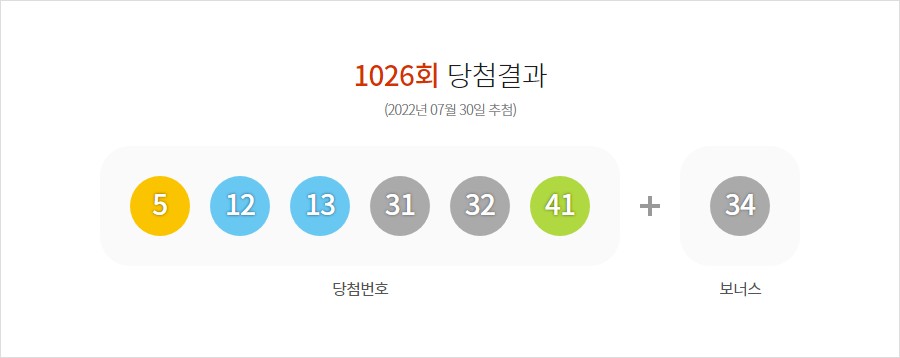 7월 30일 로또645 1026회 추첨 결과 1등 당첨번호는 5, 12, 13, 31, 32, 41번 2등 보너스번호로는 34번이 행운의 번호로 추첨되었다.