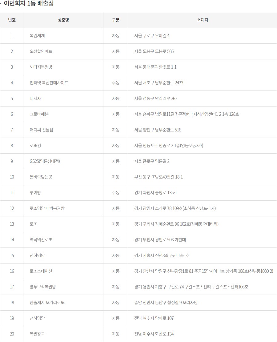로또1등 당첨판매점 당첨지역