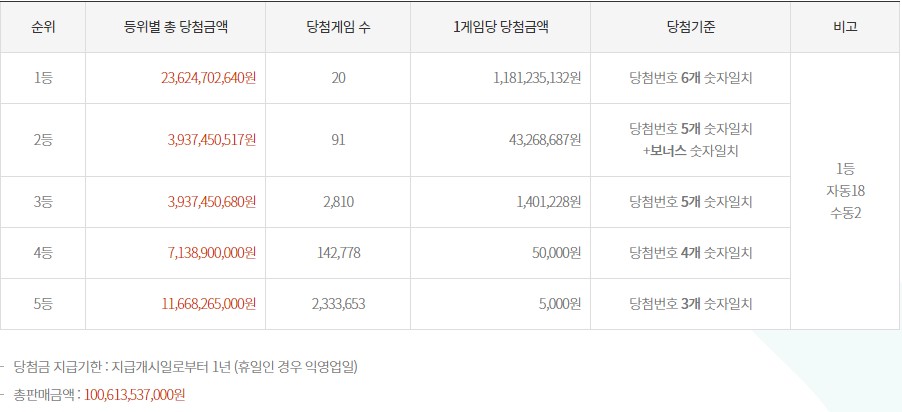 6개 모두 숫자가 일치하는 1등 게임수는 20게임으로 각각 11억 8,123만 5,132원이 1등 당첨금액으로 지급된다.