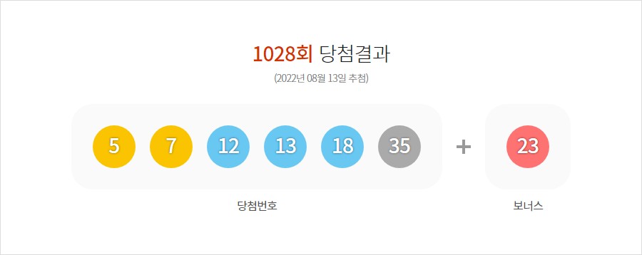 8월 13일 로또645 1028회 추첨 결과 1등 당첨번호는 5, 7, 12, 13, 18, 35번 2등 보너스번호로는 23번이 행운의 번호로 추첨되었다.